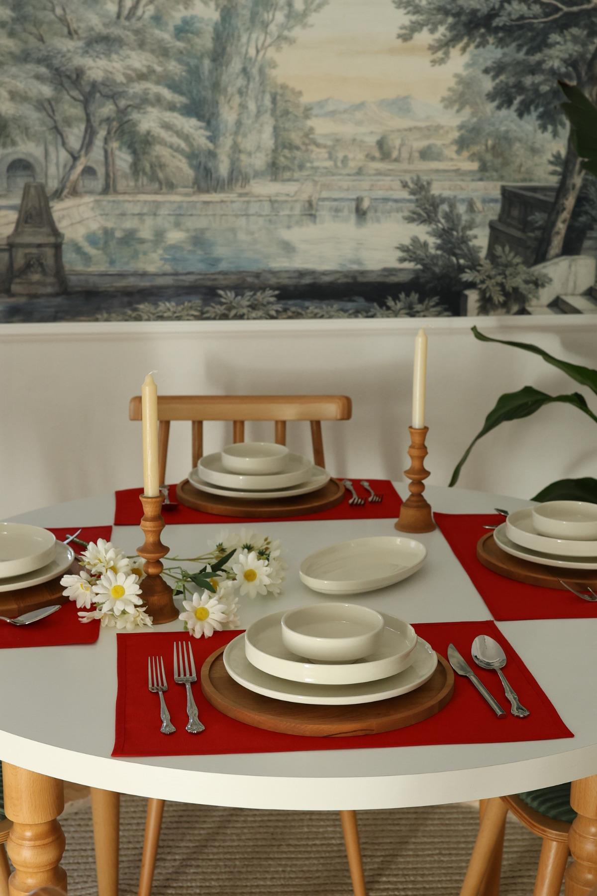 4'lü Pera Kırmızı Biye Detaylı Duck Keten Yıkanabilir, Leke Tutmaz Supla Amerikan Servis Seti