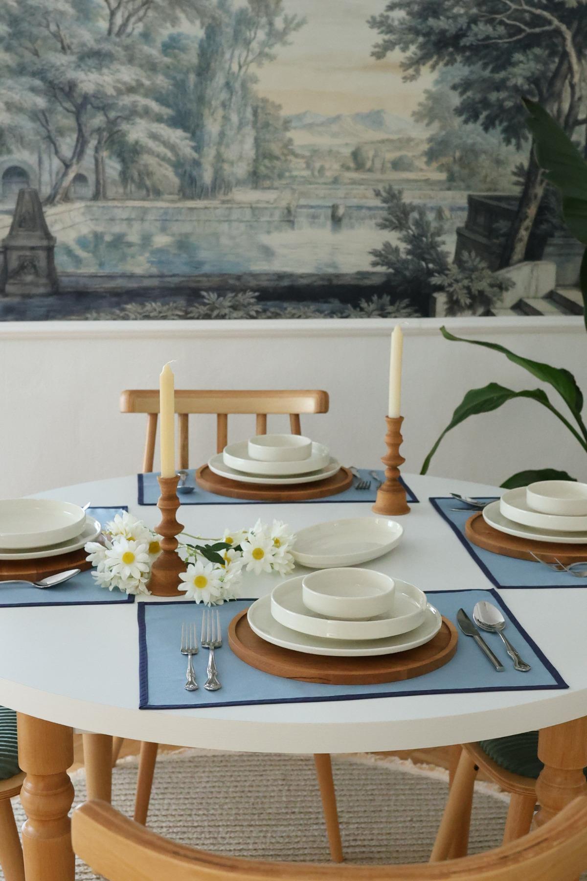 4'lü Pera Mavi Biye Detaylı Duck Keten Yıkanabilir, Leke Tutmaz Supla Amerikan Servis Seti