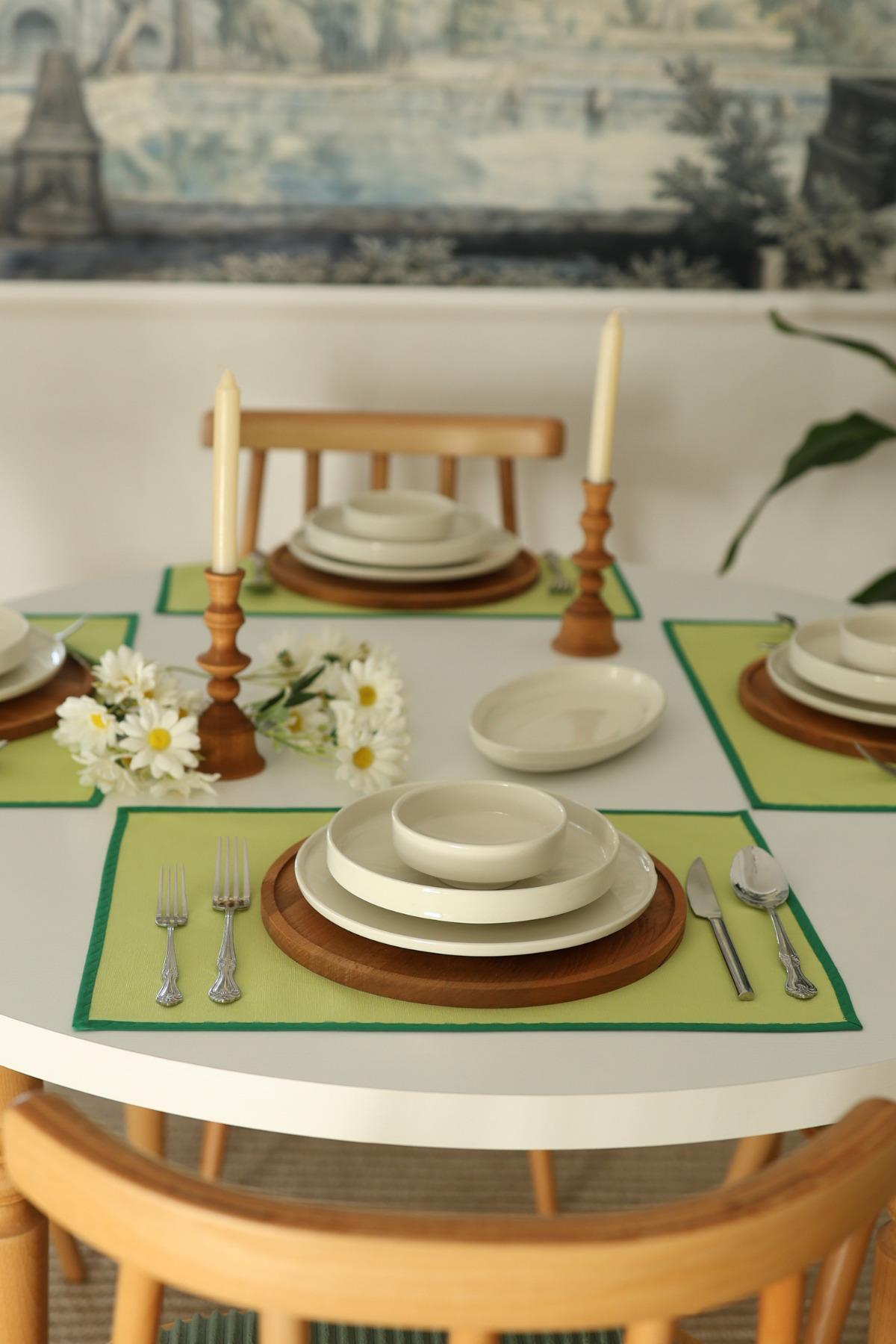 Her biri yaklaşık 35x50 cm ölçüsündeki bu servisler, kenarlarında yer alan renkli biye detayı model yapısı ile sofralarınıza zarif bir dokunuş katar. seçenekleriyle hem günlük kullanıma hem özel davetlere uygundur.
