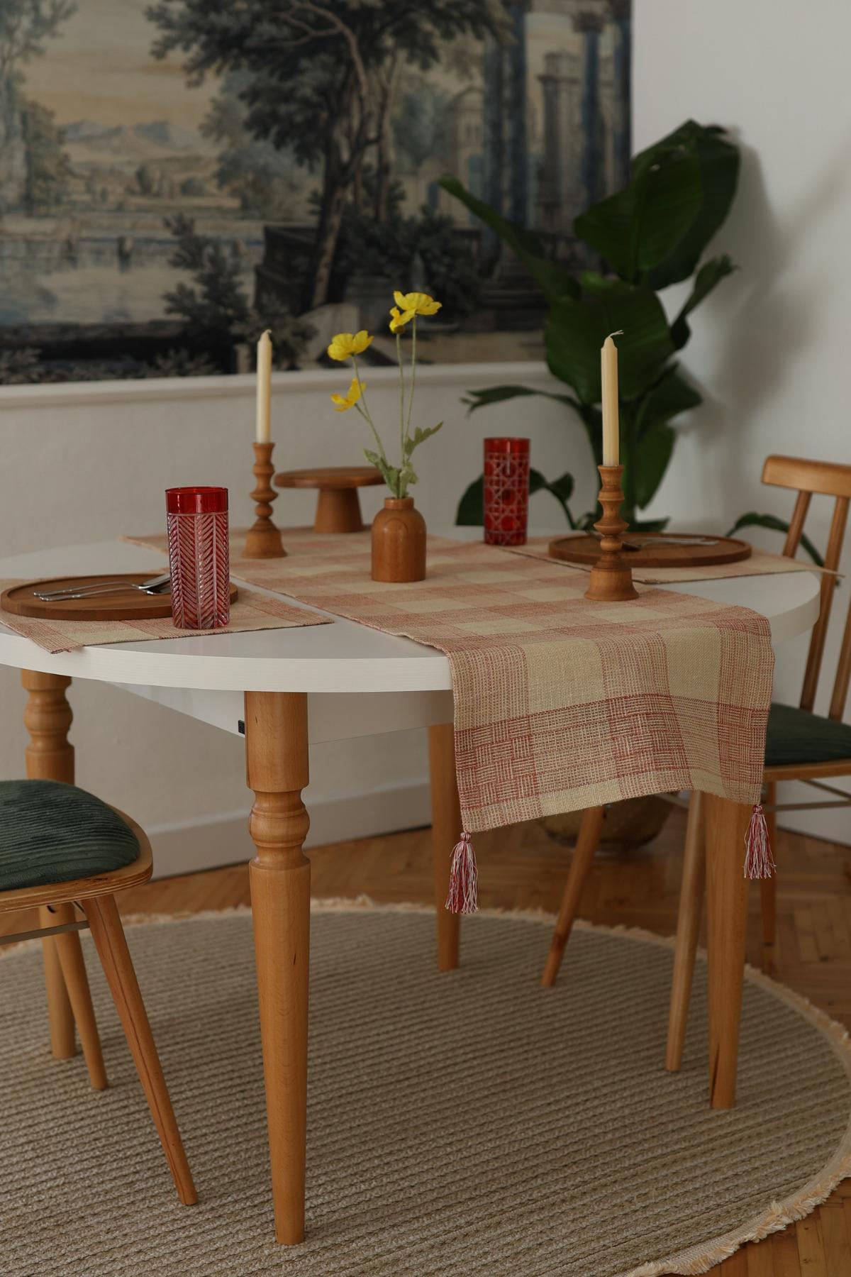 Dayanıklı jüt kumaştan üretilen runner ve amerikan servis seti, kare desenli dokusu ve püskül detaylarıyla sofralarınıza rustik ve zarif bir hava getirir.