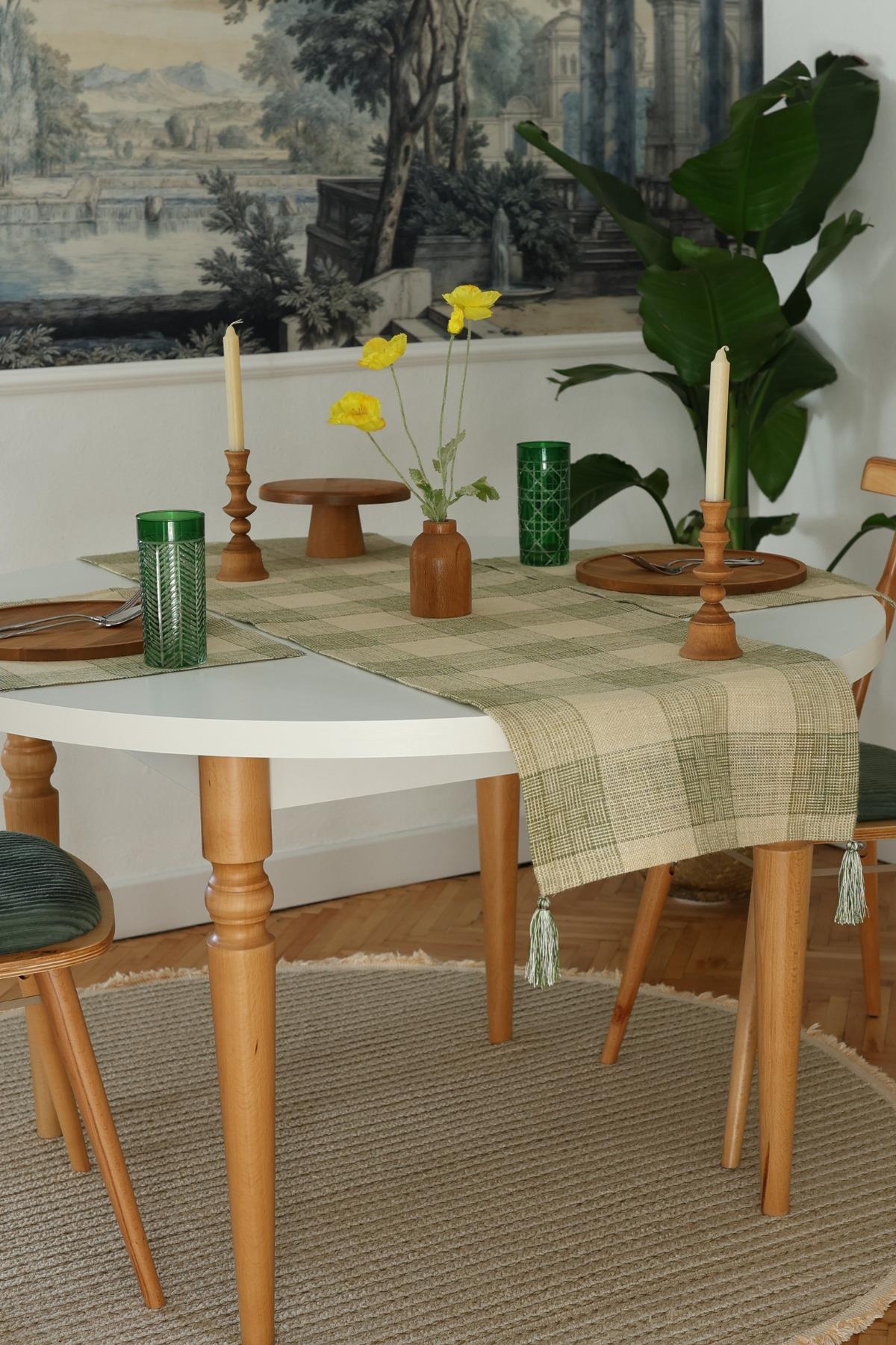 Dayanıklı jüt kumaştan üretilen runner ve amerikan servis seti, kare desenli dokusu ve püskül detaylarıyla sofralarınıza rustik ve zarif bir hava getirir.